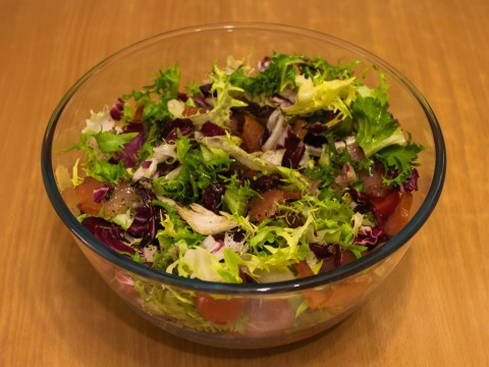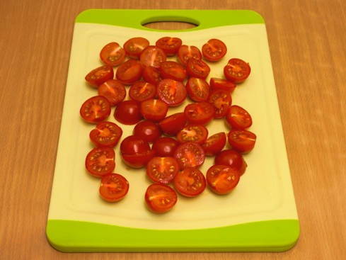 - Bereiding van de overige ingrediënten voor de salade. Was de cherrytomaatjes en sla grondig. Snijd de tomaten doormidden en doe ze in een diepe kom. Scheur de slablaadjes in kleine stukjes en stuur ze naar onze tomaten.