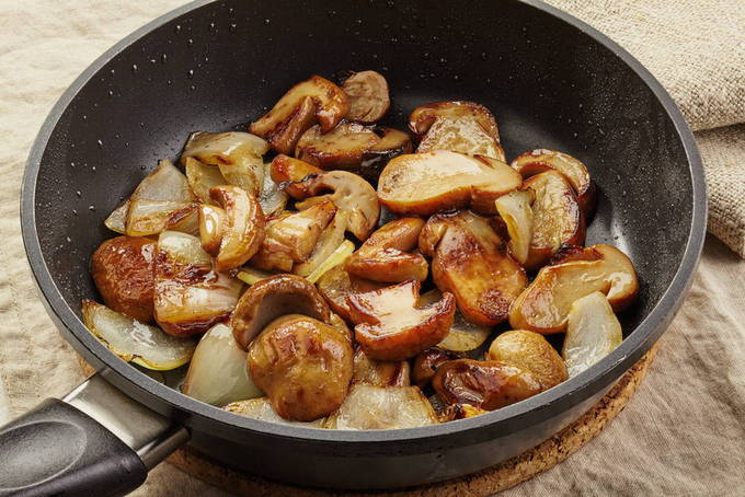 - Snijd de eekhoorntjesbrood in kleine plakjes. Verwarm een koekenpan op middelhoog vuur. Voeg olijfolie toe en bak de champignons 10-15 minuten, kruid ze met peper en zout.