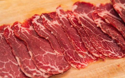 - We halen het vlees uit de vriezer. We beginnen het bevroren vlees in kleine plakjes te snijden. Hun dikte mag niet meer zijn dan 2 millimeter. U kunt een scherp keukenmes of snijmachine gebruiken. Het is de moeite waard om het vlees met handschoenen te snijden. Als gevolg hiervan moeten de plakjes dun en doorschijnend zijn. Als de dikte van het rundvlees meer dan nodig is, kun je het eraf slaan met een deegroller en het vlees tussen twee stroken huishoudfolie leggen.