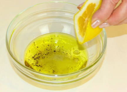 Laten we beginnen met het bereiden van de dressing en ingrediënten voor het serveren van carpaccio. Giet 2 eetlepels olijfolie in een kleine maar diepe kom. Knijp er 1 eetlepel vers citroensap bij, voeg een snufje zout toe (je kunt ook zeezout gebruiken) en een mengsel van gemalen pepers. Roer alles goed door elkaar.