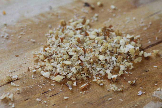 - Hak de amandelen in kleine stukjes om het gerecht te versieren. Dit doen we met een gewoon mes. Amandelen kunnen worden vervangen door andere noten naar keuze. Hazelnoten bijvoorbeeld. Snijd de zongedroogde tomaten in kleine en dunne plakjes. Parmezaanse kaas kan net zo dun geraspt of gesneden worden als tomaten.