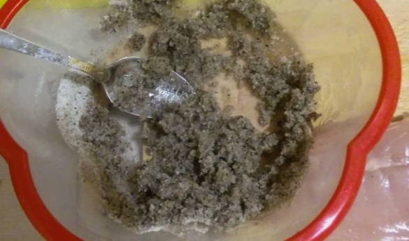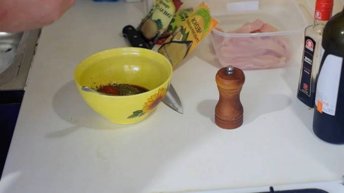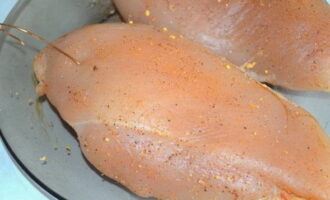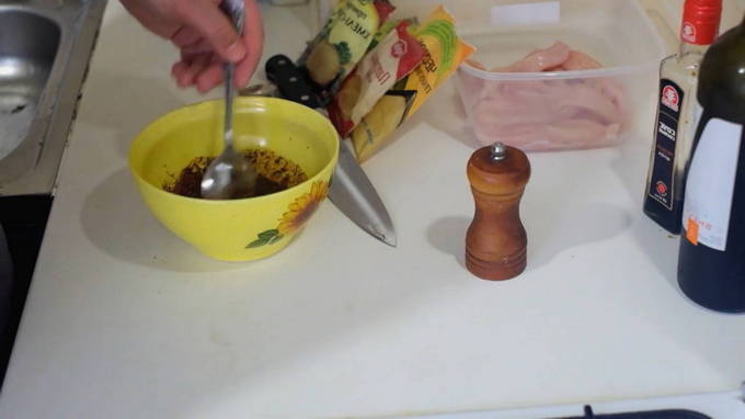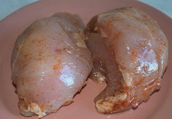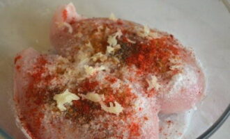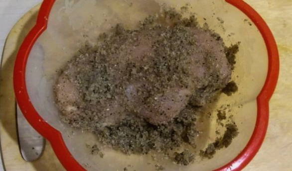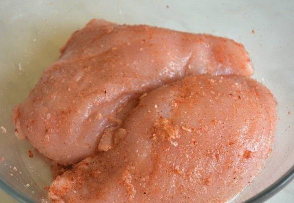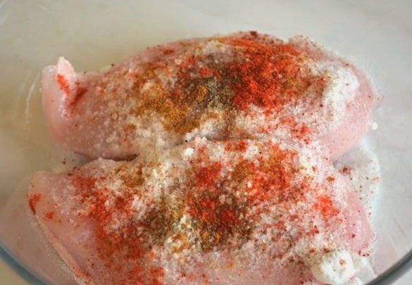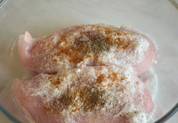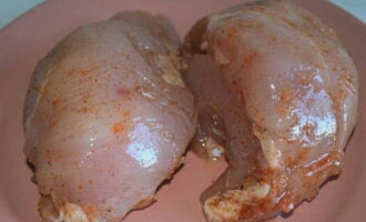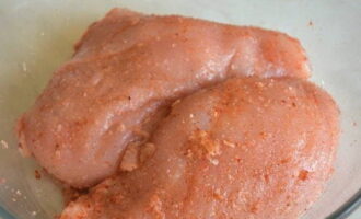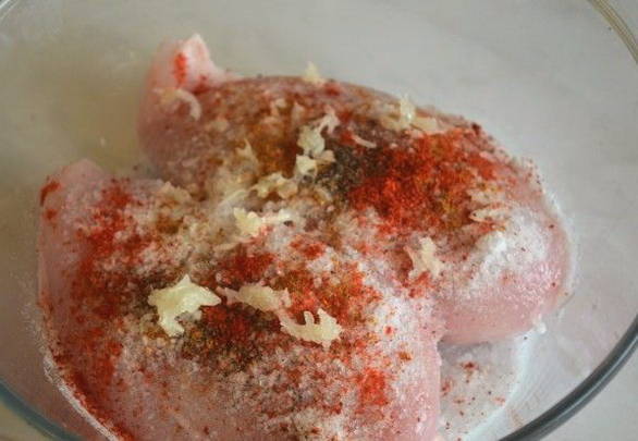 - Spoel de kipfilet grondig af, droog hem af. Voeg het beitsmengsel toe en wrijf het met je handen gelijkmatig in de kip. We laten de filet drie dagen op een koele plaats staan en kneden hem twee keer per dag.
