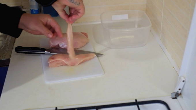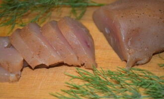 - Snijd de kipfilet in plakken van ongeveer 1 centimeter breed.