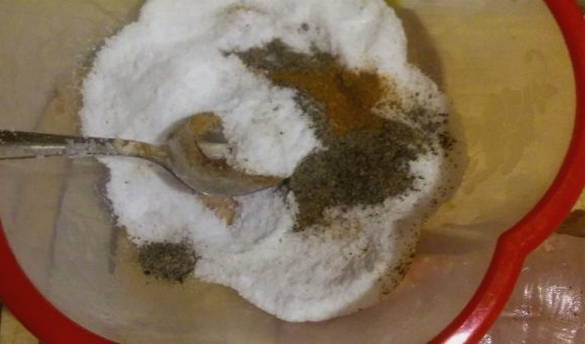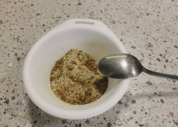 - Meng in een kom zout en peper.