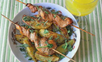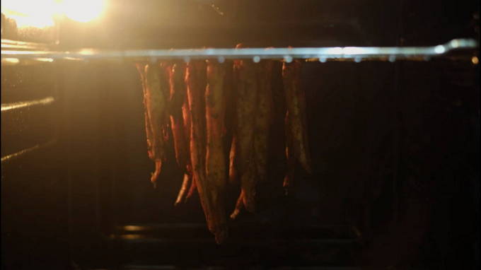 - We rijgen het vlees aan houten spiesen of tandenstokers en leggen het op het ovenrek. We stellen de "luchtstroom" -modus in de oven in en de temperatuur is ongeveer 40-50 graden, waarbij de deur op een kier blijft staan. Zo drogen we de filets gedurende 4 uur.