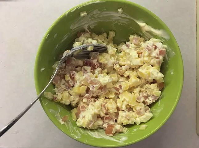 - Voeg er kaas aan toe en breng op smaak met mayonaise.