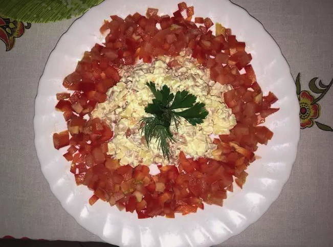 - Leg de carpaccio met kaas in het midden van het bord. Leg er peper en tomaten omheen. De salade is klaar, eet smakelijk!