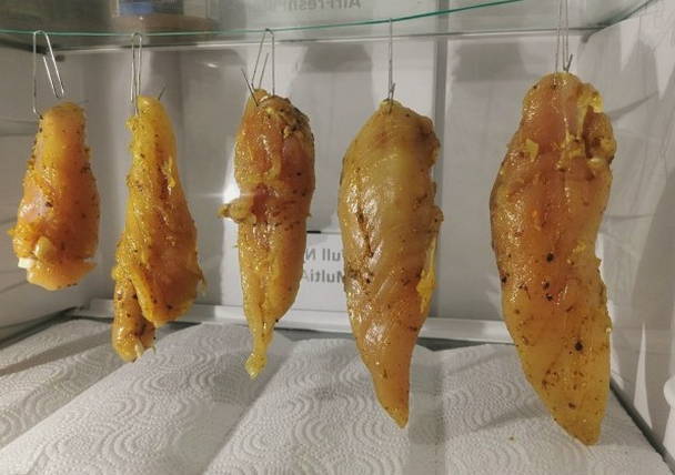 Verwijder na verloop van tijd het gaasje en hang het vlees aan de haak aan de koelkastdeur.