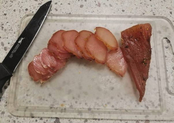 - We hangen het vlees nog een dag op in een goed geventileerde ruimte zoals een balkon. Daarna zetten we het een dag terug in de koelkast en dan weer een dag op een geventileerde plaats. We herhalen binnen 8 dagen. Snijd het afgewerkte vlees in dunne plakjes. Eet smakelijk!