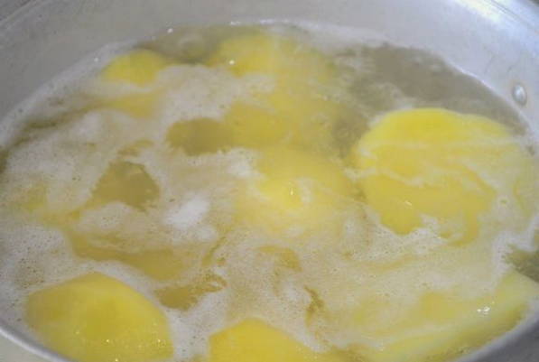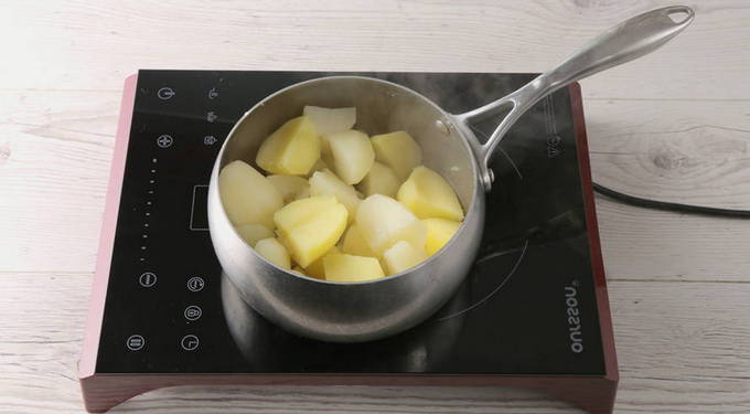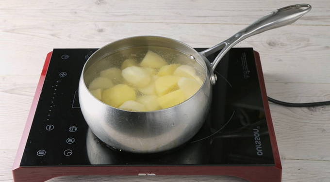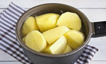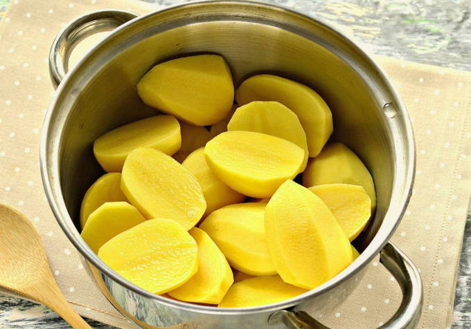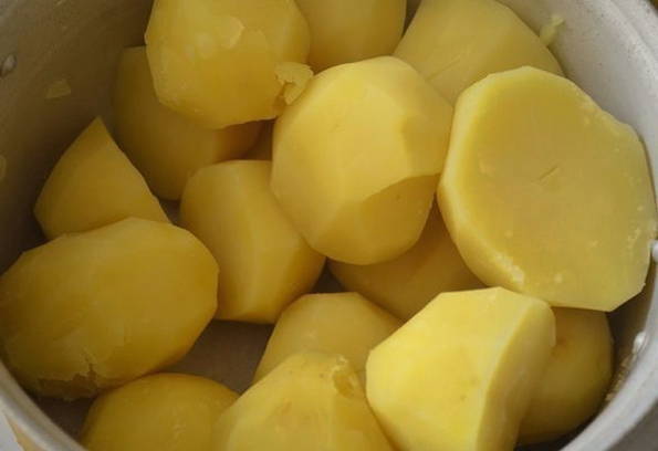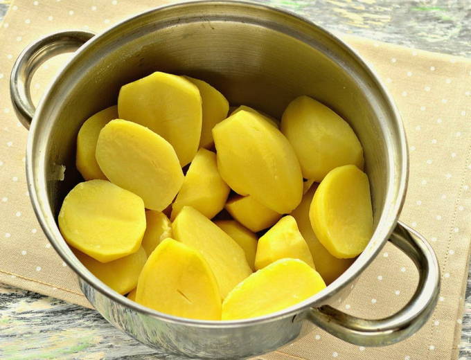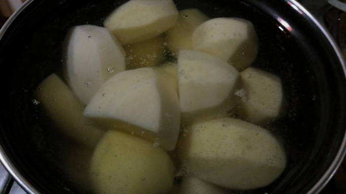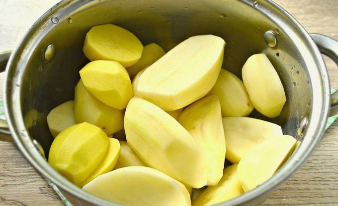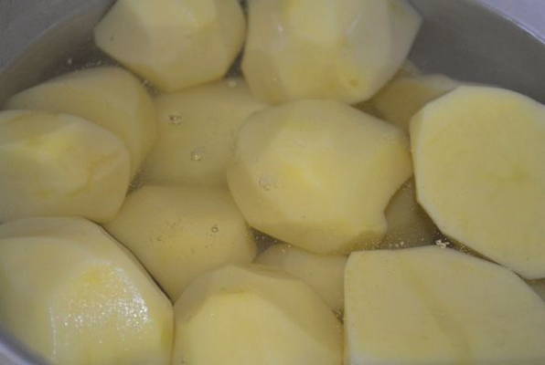 - Was de aardappelen, schil ze, snijd ze in 2-3 stukken en bedek ze met koud water.