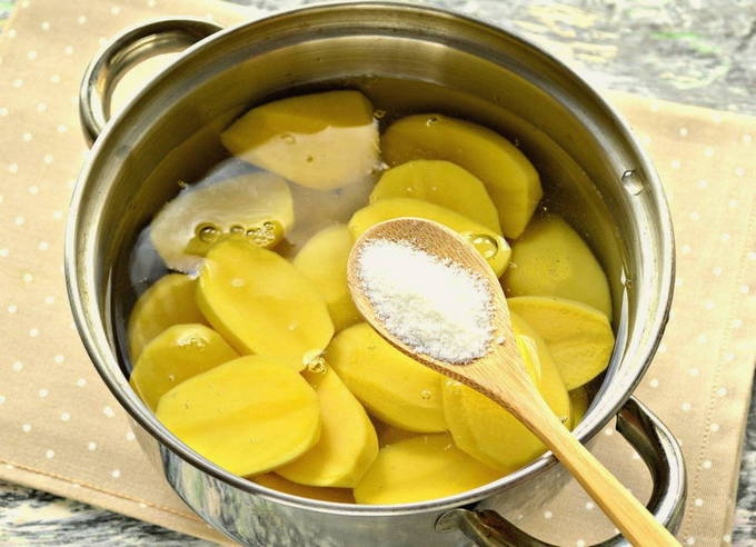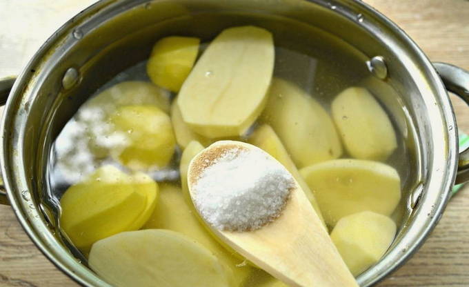 - Zet de pot met aardappelen op het vuur, als het water kookt, verwijder het schuim, voeg zout toe en kook tot het een half uur gaar is.