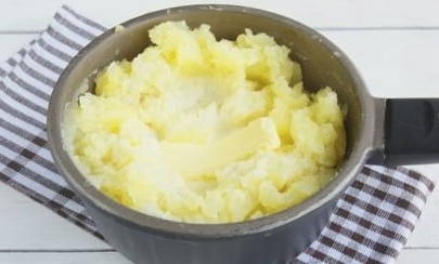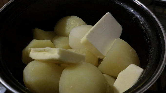 - Giet het water van de afgewerkte aardappelen af, voeg boter toe.