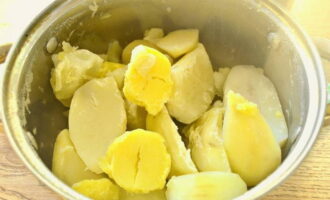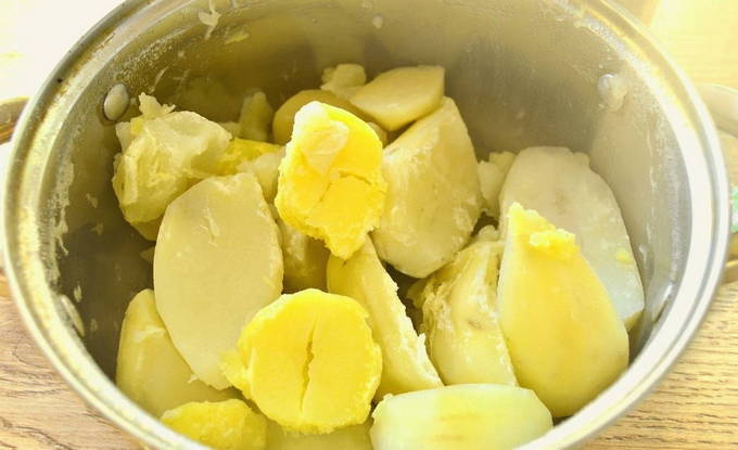 - Zet de aardappelen op het vuur, breng aan de kook, breng op smaak met zout en kook tot ze gaar zijn. Als de aardappelen helemaal gaar zijn, giet je het water eruit en droog je ze op laag vuur.