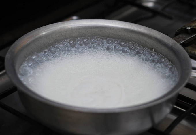- Giet de gekookte melk over de aardappelen en pureer met een blender.