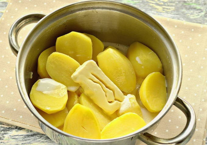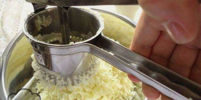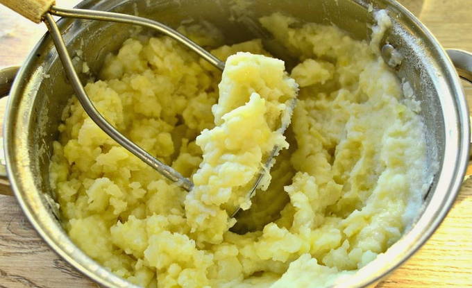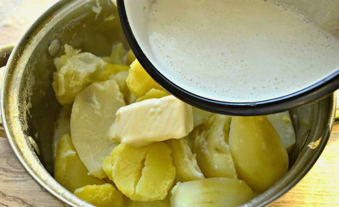 - Maal de aardappelen vervolgens met een stamper, blender of gebruik een speciale pers. Voeg in dit stadium boter en warme melk toe aan de aardappelen, roer tot een gladde massa.
