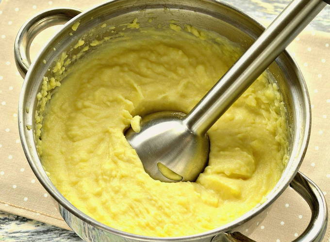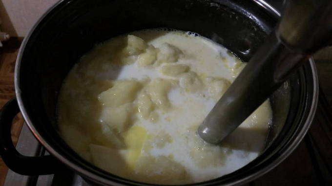 - Voeg boter en warme melk toe aan de aardappelen, klop de ingrediënten met een blender tot een luchtige, gladde massa.
