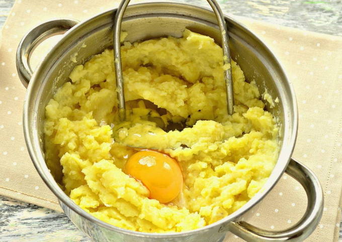 - Begin met een oogje de aardappelen te kneden, breek tijdens het koken een kippenei in de puree.