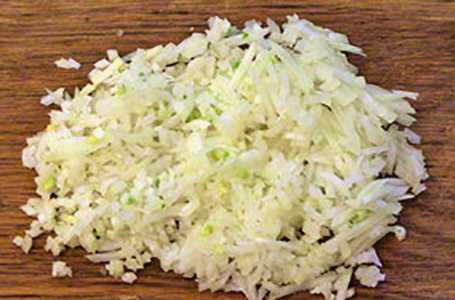 - Pel de ui, hak ze fijn en bak ze in zonnebloemolie. Wanneer de ui transparant wordt, voeg het gehakt toe aan de pan, roer, zout, breng op smaak en laat 10 minuten sudderen.