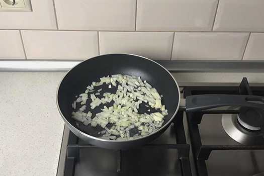 - Pel de ui en hak fijn. Bak de ui in plantaardige olie tot hij glazig is.