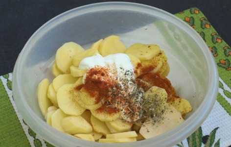 - Aardappels schillen, wassen en in dunne plakjes snijden. Voeg zure room, kruiden en zout toe, roer.