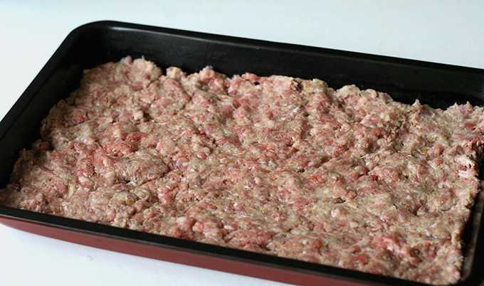 - Maak vervolgens een laag gehakt, druk deze plat.