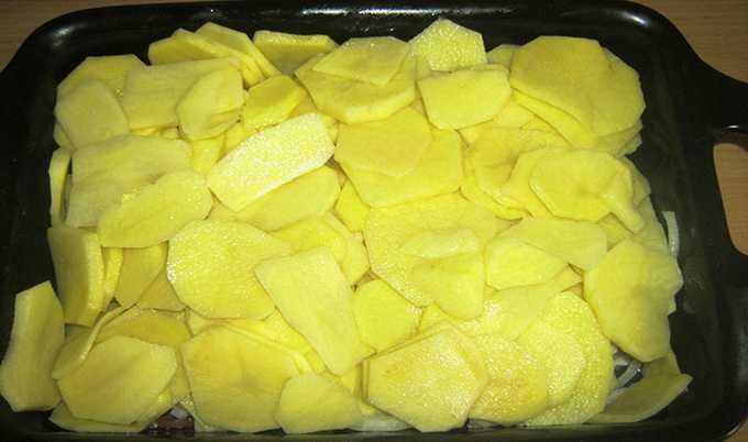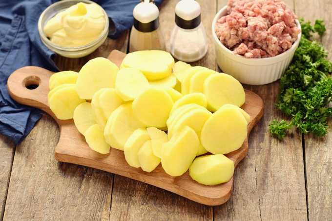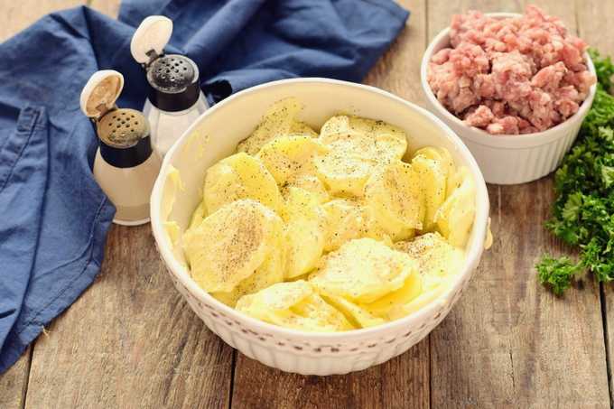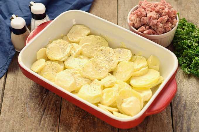 - Aardappels schillen, wassen en in dunne plakjes snijden.Vet een ovenschaal in met plantaardige olie en leg de helft van de aardappelen erop. Leg vervolgens een laag gehakt en bedek het met het tweede deel van de aardappel.