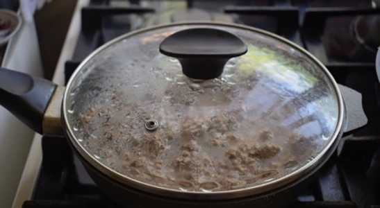 - Voeg vervolgens het gehakt toe aan de pan, zout en breng op smaak, laat 5-7 minuten sudderen onder het deksel.