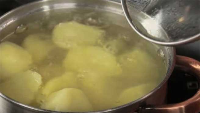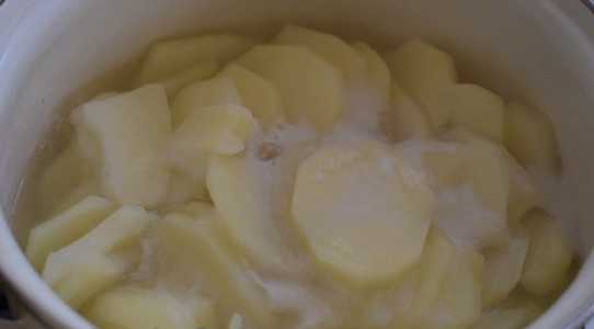 - Aardappels schillen, wassen en in dunne plakjes snijden. Dompel de aardappelen in kokend water, zout en kook tot ze gaar zijn.