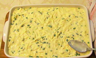 Giet de kaas- en eiervulling erover en strijk het glad met een lepel.