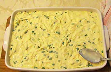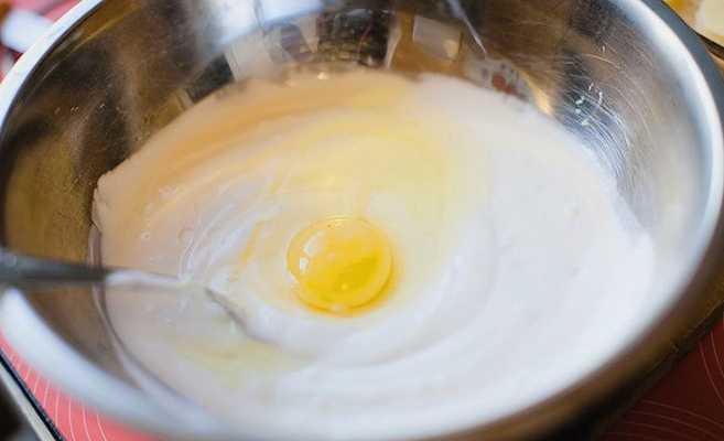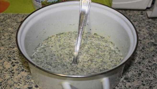 - Meng zure room, mayonaise, een kwart glas water en een ei, zout en breng op smaak. Overgiet het werkstuk met deze saus.