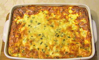 - Kook het gerecht 50-60 minuten. Haal vervolgens de braadpan eruit, bestrooi met geraspte kaas en zet nog 12-15 minuten in de oven tot er een gouden kaaskorst ontstaat. Koel het gerecht een beetje en serveer.