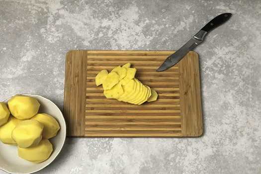 - Schil en snijd de aardappelen in dunne plakjes.