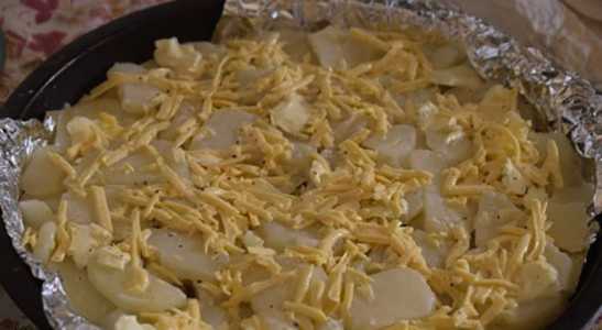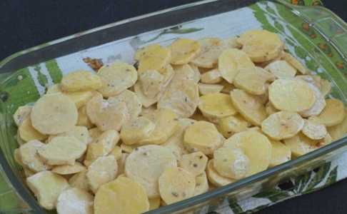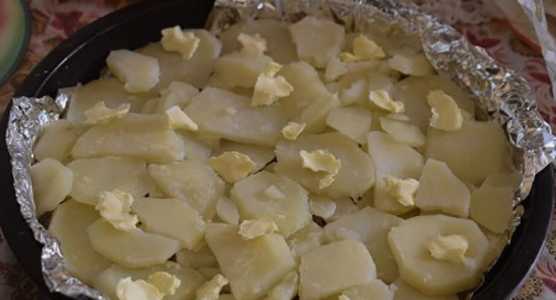 - Bedek een ovenschaal met folie, leg de eerste laag van de helft van de aardappelen. Verdeel kleine stukjes boter over de aardappelen en giet 1/3 van de vulling erover.