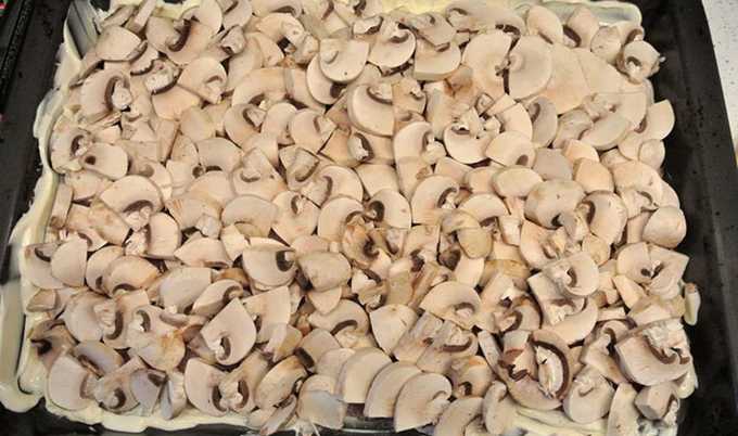 - Was de champignons en snij in kleine blokjes. Leg ze op de aardappelen, zout en bestrijk ze met mayonaise.
