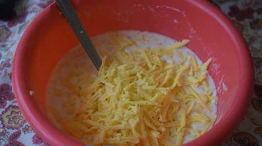 - Om te gieten, meng eieren, zure room en water, voeg zout en zwarte peper toe. Rasp vervolgens de kaas op een grove rasp, voeg deze toe aan de vulling en meng opnieuw.