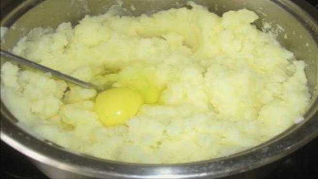 - Giet de gekookte aardappelen af in een aparte bak. Pureer de aardappelen en voeg geleidelijk de bouillon toe waarin ze gekookt zijn, zodat de aardappelpuree niet droog wordt. Je kunt de puree opkloppen met een blender. Voeg als de puree is afgekoeld een ei toe.