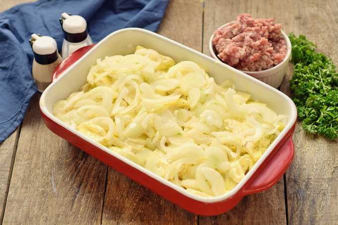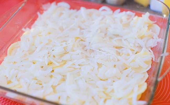 - Schil de ui, snij in dunne halve ringen en leg op een aardappellaagje.