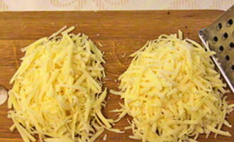 Rasp de kaas op een grove rasp en verdeel in twee gelijke delen.