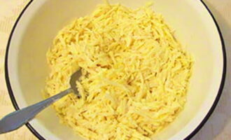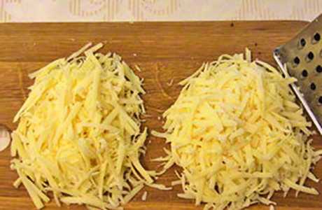 - Rasp de kaas op een grove rasp en strooi op het werkstuk.