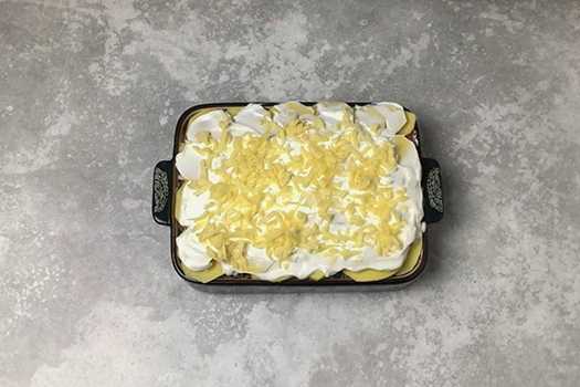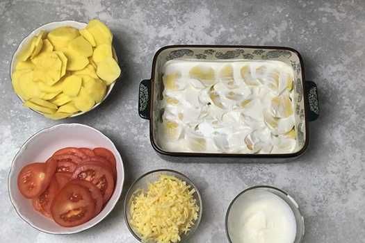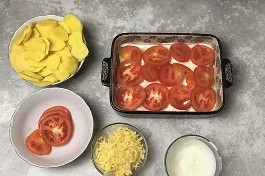 - Herhaal dezelfde volgorde van lagen: aardappelen - tomaten - gehakt. Bedek de laag gehakt met aardappelpartjes, zout, giet er zure room over en bestrooi met de resterende kaas.
