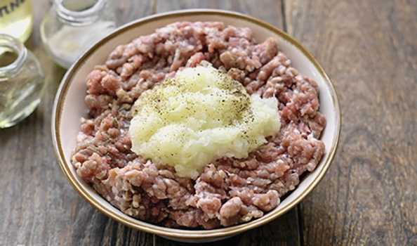 - Pel de ui en hak hem fijn in een blender. Meng het gehakt met de ui, zout en breng op smaak.