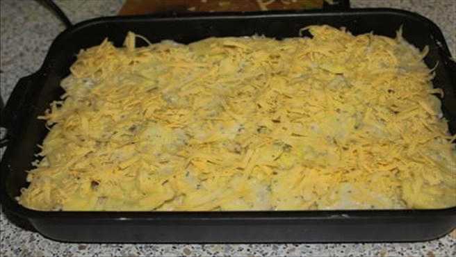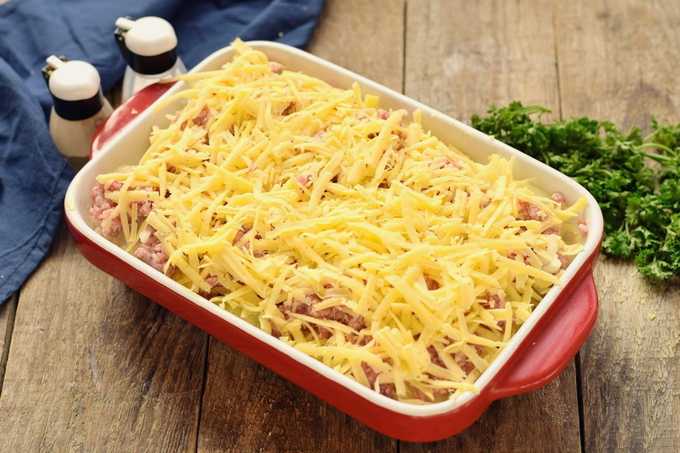 - Bedek de vorm met folie en plaats deze in de oven, voorverwarmd tot 200 graden, gedurende 40-50 minuten. Verwijder vervolgens de folie, strooi de geraspte kaas over de braadpan en zet hem 20-30 minuten terug in de oven. Serveer warm met verse kruiden en zure room.