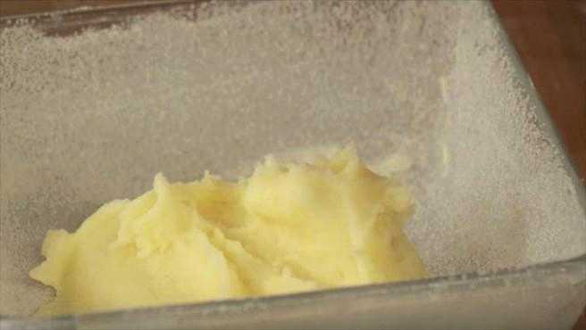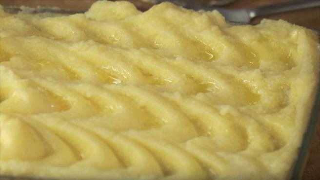 - Bedek de vleeslaag met het tweede deel van de puree. Smelt in een aparte container de resterende boter en giet deze over het werkstuk.