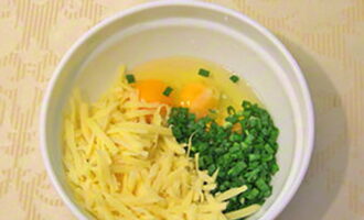 Was en hak de greens. Combineer eieren, een deel kaas en kruiden in een kom. Voeg 200 ml zure room, zout naar smaak toe en roer.