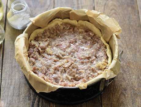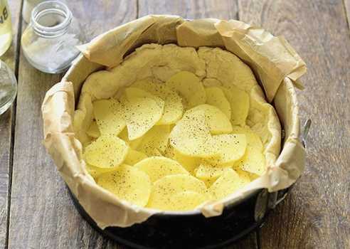 - Na een uur zal het deeg in volume toenemen. Verdeel het in twee ongelijke delen. Het grootste deel van het deeg zal dienen als basis voor de cake. Bedek het formulier met bakpapier. Vorm een hoge taartbodem met het grootste deel van het deeg, voeg aardappelpartjes, zout toe en breng op smaak.