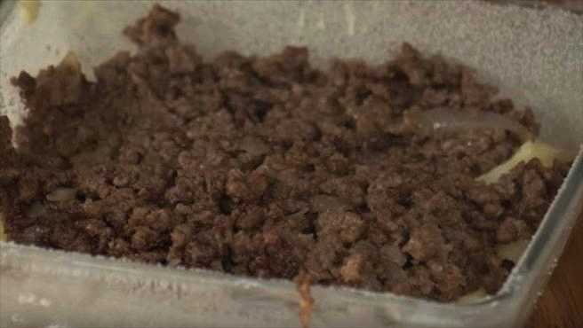 - Leg vervolgens de helft van de ui en het gehakt erop. Bestrooi deze laag met de helft van de kaas.