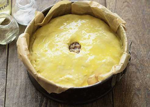 - Rol een kleiner stuk deeg uit en leg dit op de vulling, bestrijk met eigeel. Maak een gat in het midden zodat de stoom kan ontsnappen.
