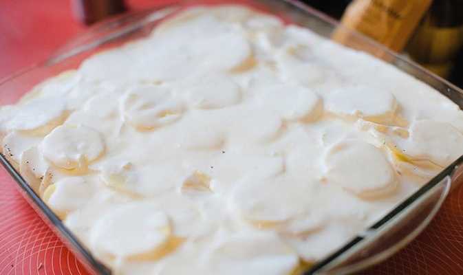 - Gebruik een geschikte ovenschaal met hoge zijkanten. Leg de onderste laag van 1/3 van de aardappelen, zout en zure room.
