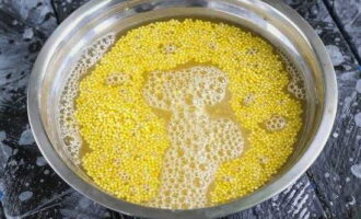 - We meten de benodigde hoeveelheid gierst. Het kan ongeveer 10 minuten in warm of heet water worden geweekt. De procedure verwijdert de overtollige bitterheid van het product.