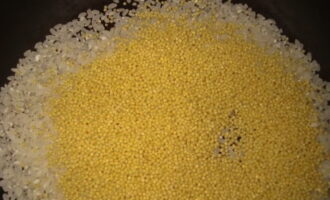 Combineer beide soorten granen in een pan en vul ze met water. We zetten op het fornuis en koken ongeveer 10 minuten na het koken.